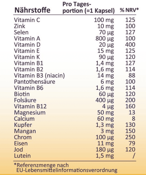 Pflanzliche Kapselhülle: Hydroxypropylmethylcellulose, Calciumcarbonat, Füllstoff: Maisstärke, L-Ascorbinsäure, Magnesiumoxid, Eisenfumarat, DL-alpha-Tocopherylacetat, Zinksulfat, Nicotinamid, Mangansulfat, Cholecalciferol, Lutein, Calcium-D-Pantothenat, Kupfersulfat, Retinylacetat, Trennmittel: Siliciumdioxid, Cyanocobalamin, Pyridoxinhydrochlorid, Phytomenadion, Riboflavin, Thiamin HCl, Chrompicolinat, Pteroylmonoglutaminsäure, Kaliumiodid, Natriumselenit, D-Biotin, glutenfrei, laktosefrei, gelatinfrei, für Vegetarier geeignet.