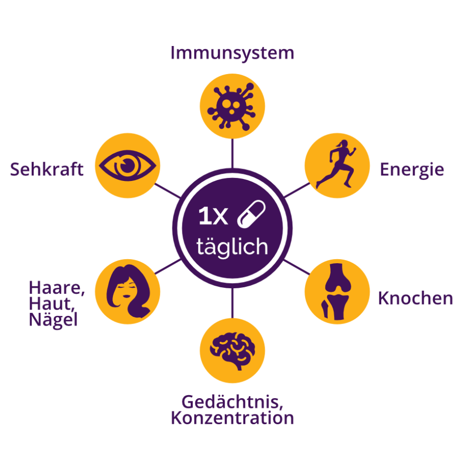 Sorgen Sie für gutes Wohlbefinden, ein starkes Immunsystem und Vitalität durch 23 Vitamine, Mineralstoffe und Lutein