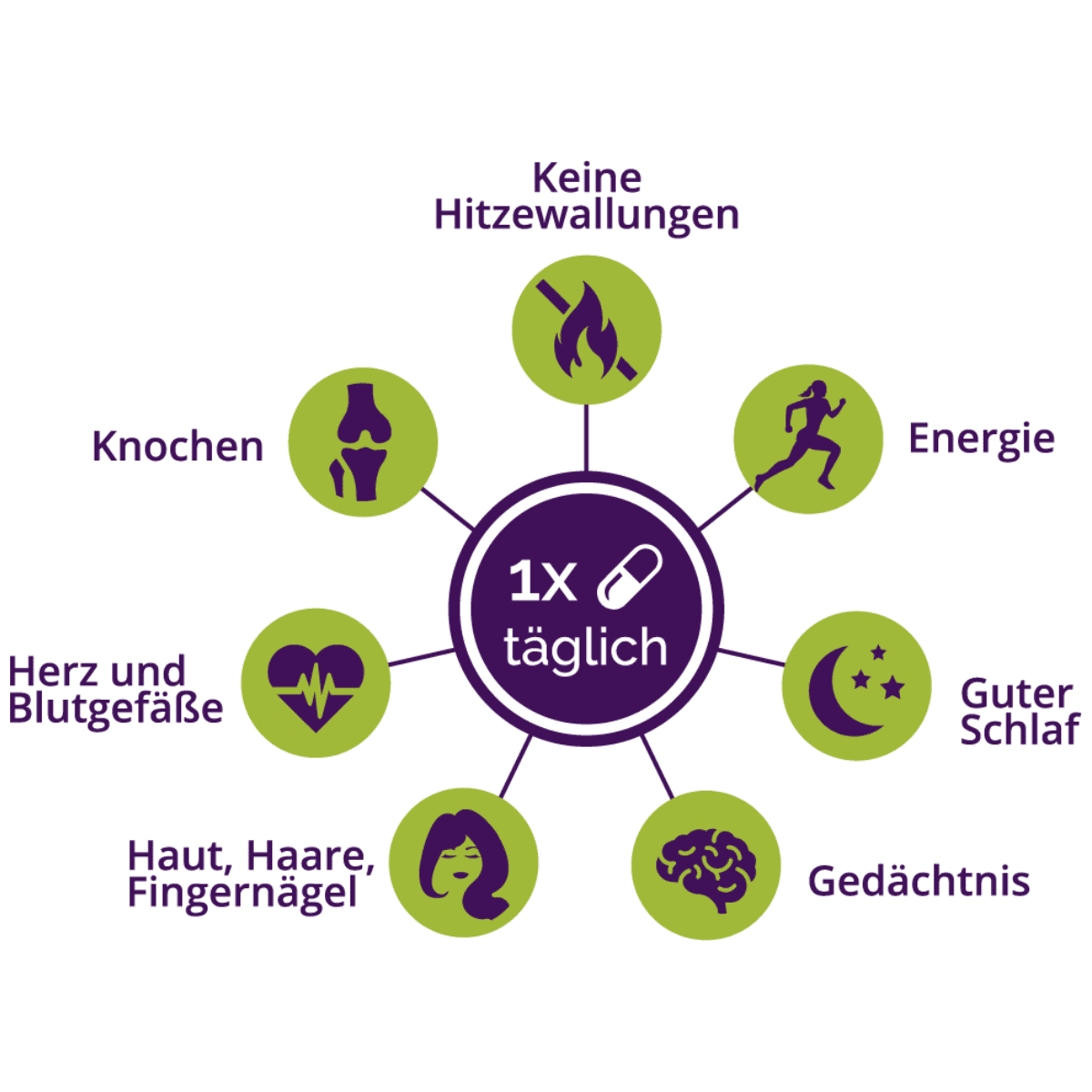 Ich bin sehr zufrieden mit dem Produkt, da ich weniger Hitzewallungen habe und meine Stimmung besser ist. Die erste Verbesserung habe ich etwa einen Monat nach der Einnahme festgestellt.